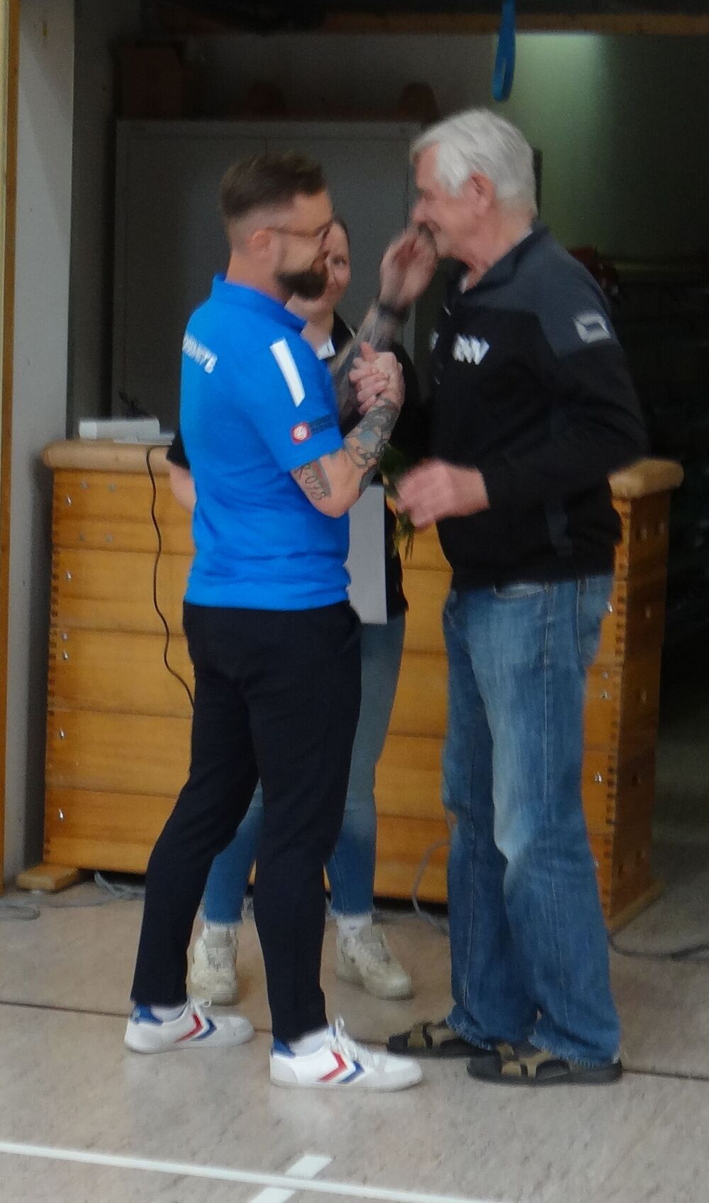 Plötzliche stehen der Vorsitzende Sachsen-Mitte Hardy Richter und Jugendwartin Melanie Friedrich auf der Platte. "Schön, dass ihr auch unser Turnier besucht", Bernd ist erfreut. Aber der Turnierstress reicht wohl noch nicht, sie haben einen besonderen Grund.