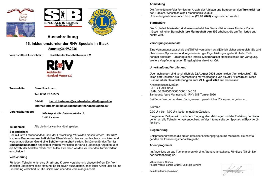 16. Inklusionsturnier SiB RHVSa 26. September 2026 Use the arrow keys to navigate between tabs Ausschreibung Meldungen Zum Vergrößern/Herunterladen auf das Dokument klicken. Noch keine Meldungen