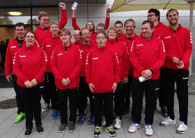 Ein Teamfoto vor der Halle. Vorfreude pur.